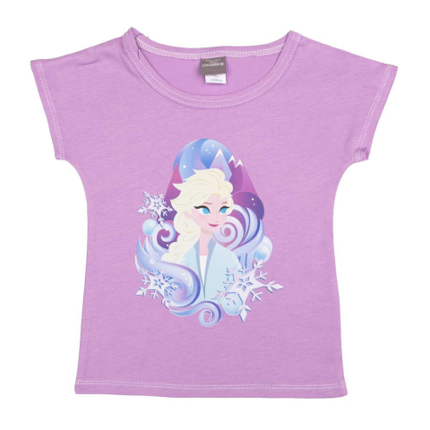 Rövid ujjú lány póló Jégvarázs mintával Fedezze fel a varázslatos Jégvarázs világát ezzel a bájos rövid ujjú lány pólóval! A lila színű háttér tökéletes kontrasztot nyújt Elza mintájának, ami minden kislány szívébe belopja