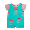 Gyöngyöző, menta színű, rövid ujjú baba napozó, melyet egy játékos medúza mintával díszítettünk. A finom, rugalmas pamut anyag nemcsak kellemes tapintású, de a baba mozgását sem korlátozza, így akár egész napos viseletre is ideális. A vállán és a lába köz
