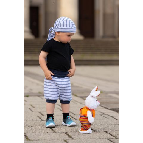 A PeggyBaby nyári kisnadrágja 100 % pamutanyagból készül, kellően vékony és szellős, így garantáltan nem lesz melege a kicsinek benne. Dereka rugalmas passzéanyag, úgy mint a lába szárának a vége is, ami színben tökéletesen harmonizál