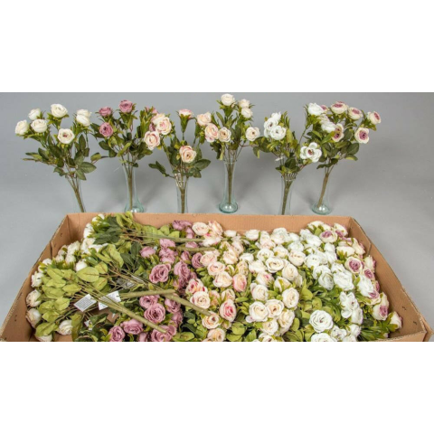 Rózsa 7 ágú selyemvirág csokor zöld díszítővel világos színekben 38 cm