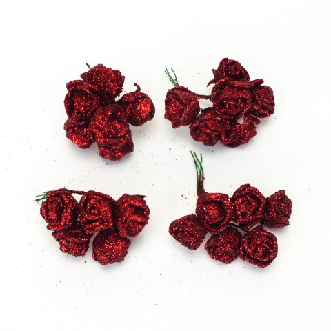 4x6 darabos csillámos rózsafej csokor. Tökéletes díszítő karácsonyi dekorációkhoz, egyedi készítményekhez és kreatív alkotásokhoz. Vékony fém szára lehetővé teszi a könnyű felhasználást. Teljes méret: 8cm, virágfej méret: 2cm