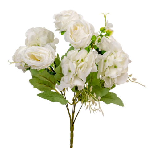 Rózsa, hortenzia csokor 9v. krém M32cm 24db/#