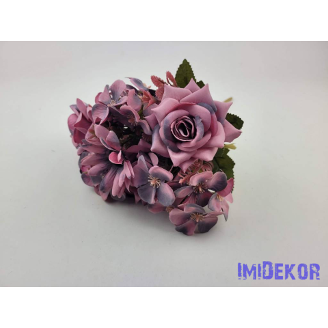 Rózsa + kis virág 7 ágú selyem csokor 29cm - Sötét Lilás Rózsaszín