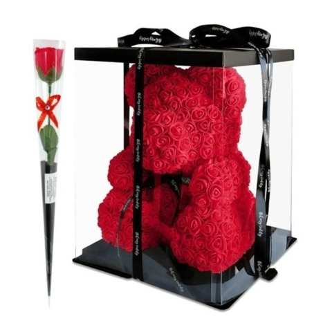 Rózsa maci díszdobozban 40 cm - piros + 1 szál szappan rózsaHungarocell maci gyönyörű 3D habrózsákkal beborítva.Minden maci kézzel készített, egyedi és örök termék.Prémium minőség, átlátszó díszdobozba csomagolva.Mérete: 40 cm (+/- 2 cm)Szappan rózsa (eredetire teljesen hasonlító, fürdővízben használható illatos szappanból készült rózsa)Gyönyörű ajándék születésnapra, évfordulóra, esküvőre, Valentin-napra, anyák napjára, baba születésére, baba