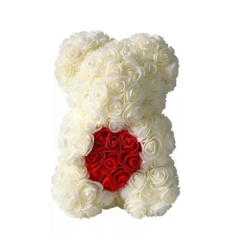 Rózsa maci, örök virág maci díszdobozban 25 cm - krémfehér-piros