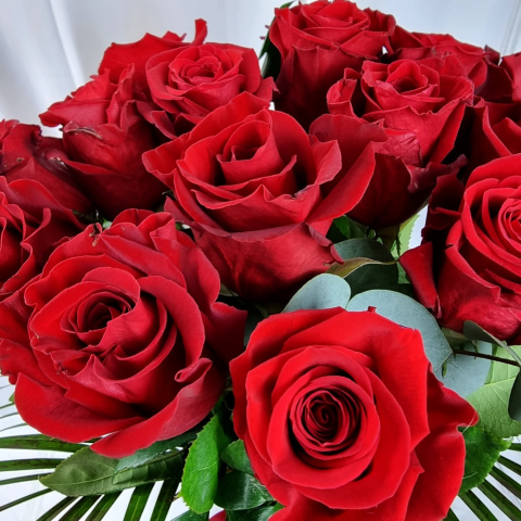 Elegáns vörös rózsa kompozíció Összetétel: 15 szál vörös rózsa pálmalevél és más egzotikus nagy levelek eukaliptusz ágak páfrány és dekoratív zöldekpapir csomagolás Méretek: magasság: kb. 60–70 cm szélesség: kb. 30–35 cm Ez a látványos virágkompoz