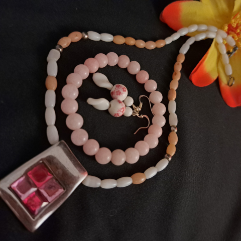 1 kép Rózsakvarc, porcelán, gyöngyház és kristály nyaklánc + fülbevaló + karkötő /767/