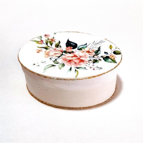 1 kép Rózsás fehér ovális dobozka, mérete: 8x6x3,5 cm