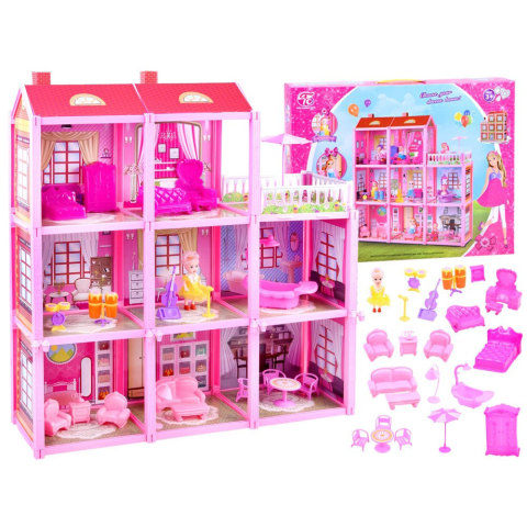 Információk A többszobás villa bútorokkal otthoni játékra készült. A játék szerkezete rózsaszín műanyagból készült, falai kartonból készültek a szobák grafikájával. A jól felszerelt készlet sok kreatív szórakozást biztosít minden gyermek számára. Ilyen