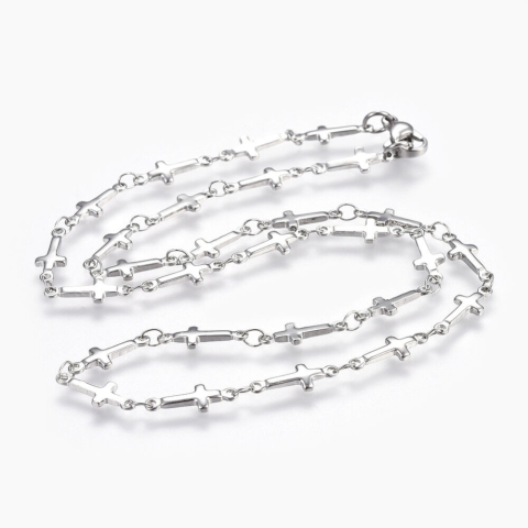Látványos kereszt motívumos rozsdamentes acél női nyaklánc, ezüst színben. Méret: Hossza 44,3 cm, szélessége 5 mm. Hosszabbítólánc kérhető (5 cm). Szemek mérete: 13.5x5x1.5 mm és 4x2.5x0.4 mm, csat: 11x7 mm, karika: 5x1 mm. Divatos,