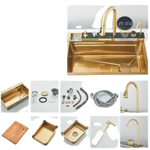1 kép Rozsdamentes acél konyhai mosogató, digitális kijelző, nagy egy tál kialakítás, Csiszolt arany