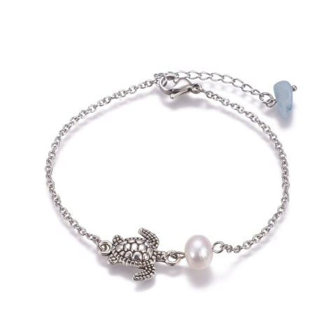 Rozsdamentes acél teknősös női karkötő akvamarinnal, 18,7 cm karkötő termékleírás