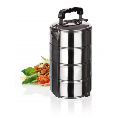 4 részes rozsdamentes acél STONE LINE ételhordó élelmiszerek és készételek szállítására. A készlet 4 db 13 cm átmérőjű és 5,7 cm magas rozsdamentes acél tálat tartalmaz. Teljes készlet magassága 21,8 cm, anyagvastagsága 0,5 cm.