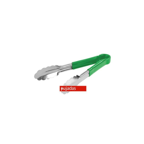 Rozsdamentes, egy darabból készült fogó, a markolatnál PVC bevonattal a kényelmesebb fogásért és a jobb szigetelésért. Kapható több méretben és fehér és piros színben a HACCP előírások könnyebb betarthatósága érdekében. E termék mérete 24 cm, színe zöld.