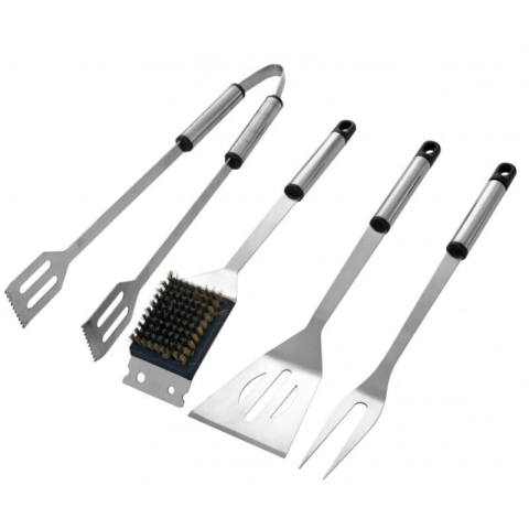 A négyrészes grillezőeszköz készletet rozsdamentes acél csipesz, forgatólapát, villa és kefe alkotja. A készlet a grillezéshez szükséges alapvető eszközöket tartalmazza. Az eszközökön van akasztószem.