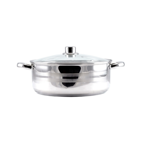 Anyaga: rozsdamentes acél Méretei: külső átmérője: 29,5 cm, belső átmérője: 28,5 cm, szélessége fülekkel: 39 cm, magassága fedő nélkül: 11,5 cm, magassága fedővel: 16 cm Űrtartalma: kb 6 l Súlya: 1,65 kg Használható: gáz-, kerámialapos -, elektromos-, és