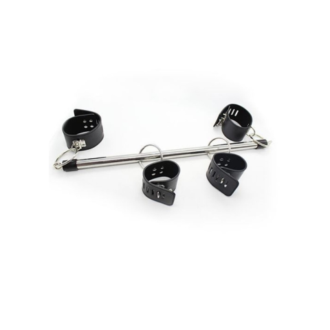 Rúd,kéz és láb bilincsekkel és lakattal.A bilincsek erős műbőrből, állítható méretűek.4db lakat kulcsokkal a csomagban.Bilincsek szélessége:5,5cm.A fém távtartó hossza:56cm.
