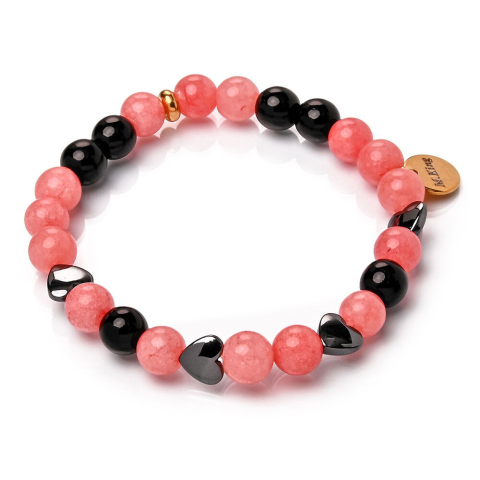 RUGALMAS KARKÖTŐ, a mérete választható.Az ékszer ásványai és tartozékai:– 8 mm-es vörös kalcedon gyöngyök– 8 mm-es fekete ónix achát gyöngyök– Hematit Szív, 8 mm– M.King márkajelzésű nemesacél logóbiléta a csatnál–