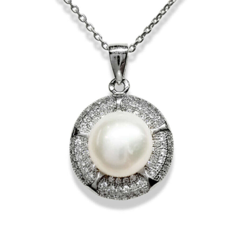 Ezüst Gyöngy Medál: Elegáns és időtálló szépség ✨ Ez a kézzel készített nyaklánc egy 8 mm-es, valódi tenyésztett gyönggyel díszített ezüst medált tartalmaz, melyet csillogó cirkóniák vesznek körül. A gyöngy enyhén rózsaszínes árnyalatú, gyöngyházfén...