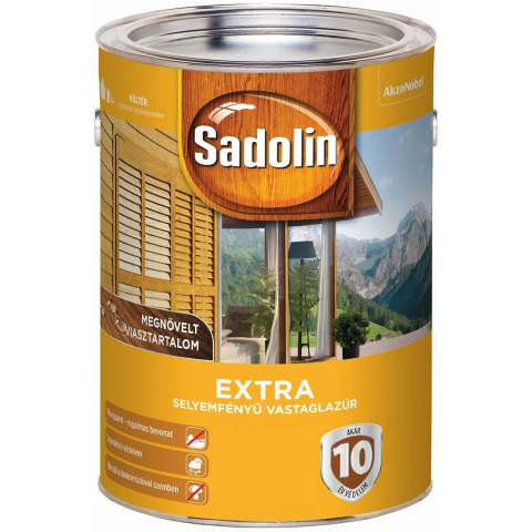 A Sadolin extra kültéri, selyemfényű vastaglazúr óvja és díszíti a kültéri fafelületeket. Hosszantartó védelmet biztosít az időjárással, valamint a nap UV-sugárzásával szemben. A Sadolin extra puhafa és keményfa felületek bevonására, natúr vagy már létező sértetlen, áttetsző bevonat festésére ajánlott. Vízlepergető hatású, és kiemeli a fa természetes szépségét. A megújult Sadolin extra új összetétele révén még jobban beszívódik a fába, ezál