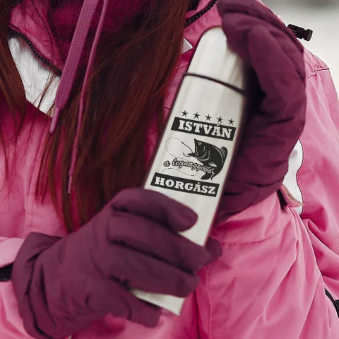 Egyedi ajándék horgásznak, saját neves termosz. A legnagyobb horgász feliratos termosz, bármilyen névvel rendelhető ezáltal válik személyessé, egyedivé az ajándékod. Termosz űrtartalma 500ml, anyaga fém és műanyag. Stílusos és praktikus rozsdamentes a