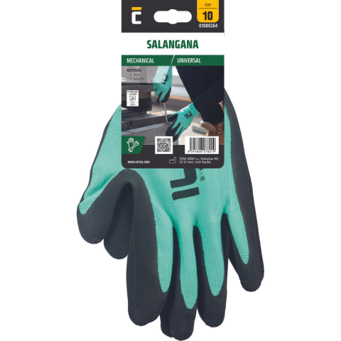 SALANGANA kesztyű akasztófül zöld 6 • varrat nélküli poliészter kesztyű, rendkívüli fogásbiztonság száraz és olajos környezetben • víz- és olajálló a latex mártással