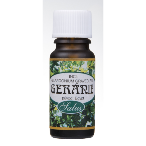 A Saloos (Salus) márkájú Geránium illóolaj antidepresszáns és nyugtató hatású. Hatásos női problémák, mint a menstruáció és premenstruációs szindróma esetén, jótékony hatást gyakorol a húgyutakra és gyógyítja a sebeket. Alkalmazzák herpesz és szájüregi fekélyek kezelésére, enyhíti a fejfájást és migrént. Kiváló zsíros bőr kezelésére, kiegyensúlyozza a faggyúmirigyek működését. Mivel serkenti a nyirok- és vérkeringést, biztosítja a bőr meg