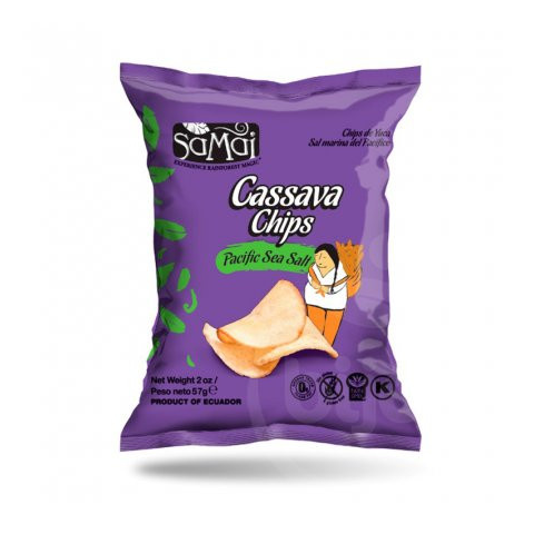 Samai cassava chips tengeri sós 57 g Ropogós cassava chips, mely kis adagokban, tengeri sóval ízesítve készül. A cassava chips 30%-kal kevesebb zsírt tartalmaz, mint a hagyományos burgonya chips. A SAMAI Cassava chips prémium minőségű cassavából készü