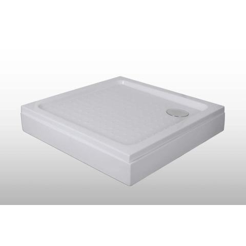 Szögletes, üvegszál erősítésű alacsony zuhanytálca levehető előlappal, fém merevítéssel, extra erős fém lábakkal és szifonnal.