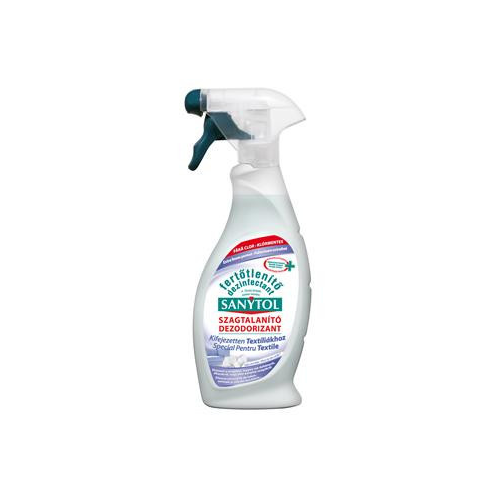 Fertőtlenítő- és szagtalanító spray, 500 ml, SANYTOL, textíliákhoz Kifejezetten textíliákhoz való fertőtlenítő és szagtalanító, mely az anyag belsejében hat. -klórmentes -hármas hatás: elpusztítja a baktériumokat, gombákat, vírusokat -megszünteti