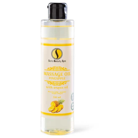 A Sara Beauty Spa ananászos növényi masszázs olaj értékes természetes anyagokat és növényi kivonatokat tartalmaz. Az argán olaj és az E-vitamin ápolja és puhítja a bőrt. Hosszan tartó síkosságot biztosít.