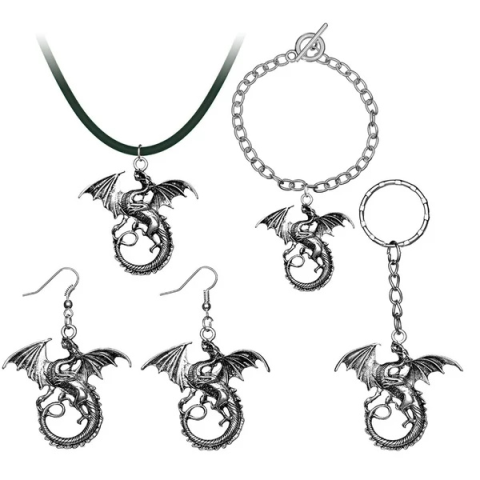 Misztikus sárkány ékszer szett nyaklánccal, karkötővel, fülbevalóval és kulcstartóval. Kitűnő választás fantasy rajongóknak és különleges ajándékötlet