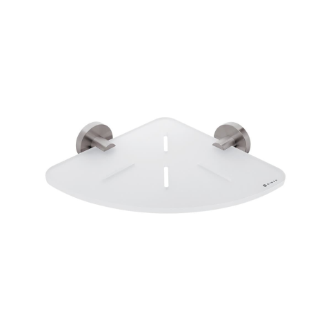 Plexiüveg sarokpolc marással. Fogantyúk csiszolt rozsdamentes acélból. A furatokkal ellátott plexiüvegből készült sarokzuhanyzó polc nagyszerű kiegészítője a fürdőszobának. Fényes vagy matt? A fürdőszobai kiegészítők kiválasztásakor nemcsak a praktikus oldalt, hanem a formatervezést, a kivitelezést és a matt vagy fényes feldolgozás módját is figyelembe veszi. A fényes szép, szó szerint tükrös. A matt természetesebb, kellemesebb, és hangulatosabbá teszi a