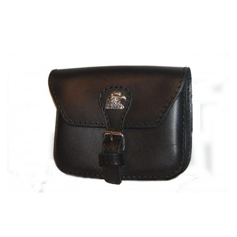 Valódi bőr övtáska, fém sasfejjel díszítve. Hátulján 2 db bőr bújtató az övhöz való felfogatáshoz. Kézzel készült, magyar bőrdíszműves termék. Külső mérete: 16,5 x 12 x 3 cm. A sasfej minta eltérő lehet!