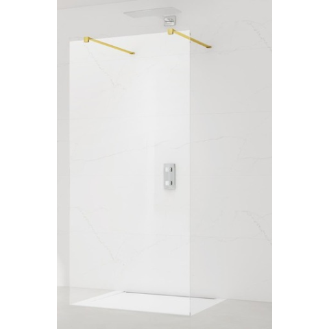 Walk-in zuhanyparaván arany fényes kivitelben, a felület átlátszó üvegből készült dekor nélküli. Easy Clean felületkezeléssel, amely megkönnyíti a tisztítást, és minimalizálja a vízkőlerakodást. Fix - nem nyitható meg. bal és jobb oldali tájolás is.