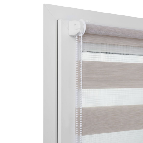 A vászon anyag sötétebb és átlátszó csíkjai a gyöngylánc mozgatásával váltakoznak, így szabályozhatjuk, hogy mennyi fényt engedünk be.