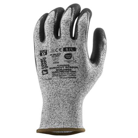 SC560N VÁG.BIZ. KESZTYŰ TENYERÉN DUPLA FEKETE NITRIL_11 Szürke, pettyezett, HPPE-vel, sáványi szálakkal, poliamiddal és elasztánnal erősített varrás nélküli kesztyű. Fekete duplán mártott tenyér, egy sima rétegű és egy érdesített. Kötött mandzsetta. O