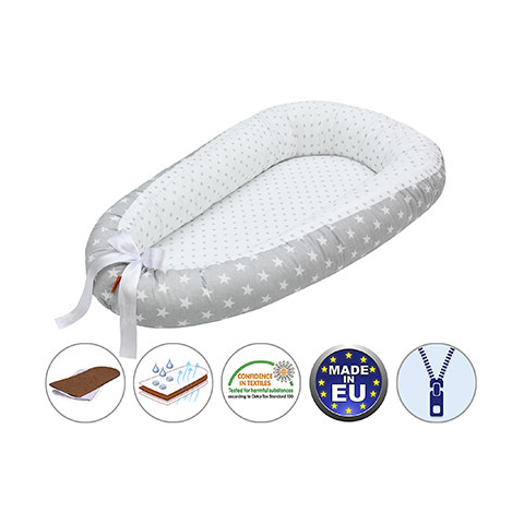 Babafészek/Mouse Kódszám: BF009 Anyaga: Huzat: 100% pamutvászon Perem töltet: 100% szilikonizált poliészter Fekvőfelület: latexált kókusz Kókuszmatrac huzat: 100% frottír A Scamp babafészek bárhol és bármilyen helyzetben otthonos környezetet biztosít