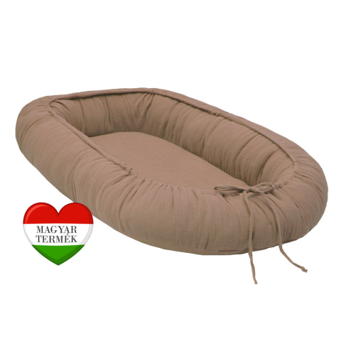 Scamp muszlin babafészek, barna színben.Méretek:Teljes mérete: 50cm×80cmFekvőfelülete: 28×60 cmMagassága:12cm Anyaga:Huzat: 100% pamut un. muszlinPerem töltet: antiallergén, 100% szilikonizált poliésztergolyóA termék a fekvőbetét eltávolítása után 30°C-on