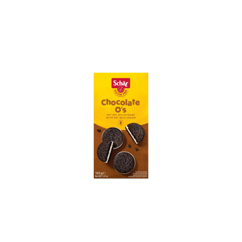 Chocolate O's - Gluténmentes kakaós keksz tejkrémes töltelékkel. Összetevők: Tejkrém 35 % [növényi zsírok (kókuszolaj, pálma), teljes tejpor 6,5 %, szőlőcukor, cukor, kukoricakeményítő, pálmazsír, laktóz (tej), emulgeálószer: szójalecitin; természetes