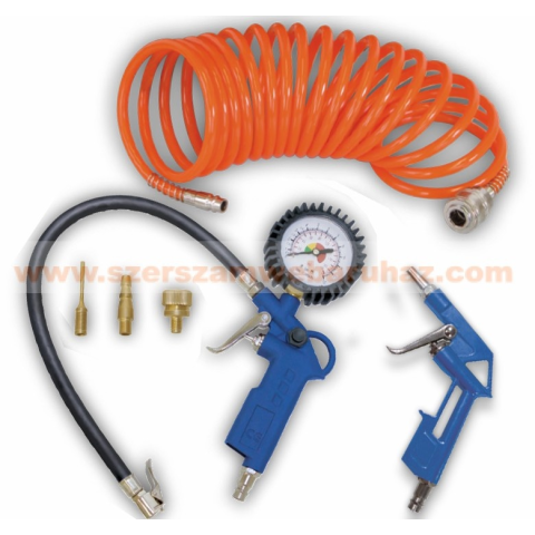 Alap kiegészítő szett, amely nem hiányozhat egyetlen kompresszorhoz sem A fémötvözetből készült szerszámok gyorscsatlakozóval vannak ellátva A szett tartalma: Fúvópisztoly -tisztításhoz vagy szárításhoz Kerékfújó pisztoly -manométerrel, védő
