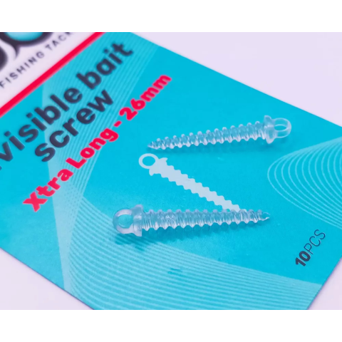 Plastic Bait Screw - Xtra long - 26mm – Víz alatt láthatatlan – Extra könnyű ; Újra használható – Csavaros kialakítás – Könnyű csalifúrás és stabil tartás - Extra hosszú forma -10db / csomag Gyors és biztonságos csali felhelyezést és rögzítést tesz lehetővé horgunkra vagy hajszálelőkénkre. Legyen az bojli, popup, szemes nagy szemű magvak vagy pedig bármilyen plasztik csali imitáció. Több fajta felkínálási módot tudunk alkalmazni az Invisible P