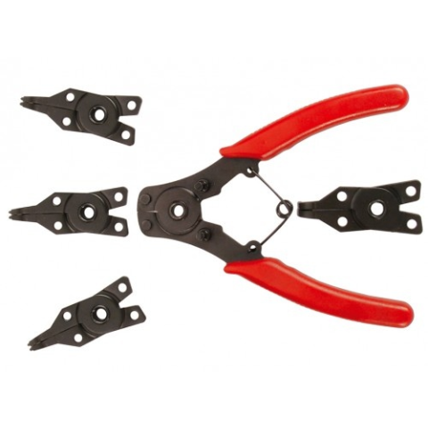 Speciális Seeger fogó, cserélhető belső, - és külső fejekkel, melyek bármikor cserélhetőek a könnyed munka érdekében. Tulajdonságok: - 4 db cserélhető fejjel a belső és külső körökre - Belső és külső: - A fogó 160 mm hosszú - 2 fej, egyenes (kívül és