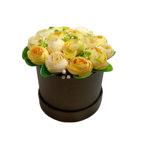 Sárga árnyalatú virág doboz, selyemvirágokkal. A doboz papírból készült, bronzos árnyalatú festéssel. Különleges ajándék nőnapra, születés- és névnapra, anyák napjára, évfordulóra, egyéb alkalmakra. A doboz mérete 10cm, a virágokkal a teljes magassága kör