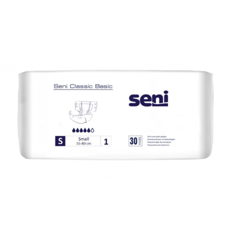 Seni Classic Basic Small egyszerhasználatos légáteresztő nadrágpelenka középsúlyos és súlyos inkontinencia kezelésére. - bőrbarát – a külső rétege légáteresztő laminátumból, az oldalsó szárnyai puha és légáteresztő szálfátyolból hagyják a bőrt szabadon l