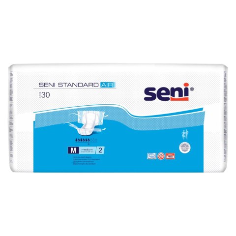 Seni Standard Air pelenka M 30db (1800ml) méret : 75-110cm - dupla nedvszívó mag a még szárazabb érzésért - nedvesség indikátorral ellátott termék, ennek segítségével információt kaphatunk a csere szükségességéről - dupla tépőzáras ragasztószalag, ame