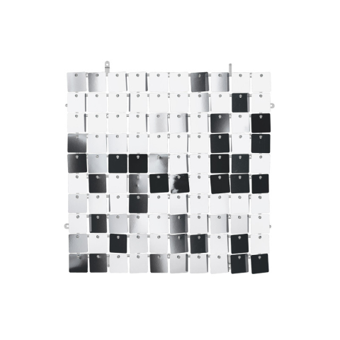 Erős műanyag vázon lévő fényes, fényvisszaverő négyzet alakú lapocskák, ezüst színben. A tábla mérete kb 30*30 cm Több darab összeszereléséből látványos főasztalhátteret, fotófalat készíthetünk.