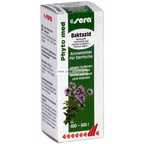 Sera Phyto med Baktazid – 30 ml (400–600 liter) (32280) A Sera Phyto med Baktazid egy növényi alapú gyógykészítmény díszhalak számára, amely hatékony védelmet nyújt külső bakteriális fertőzések ellen a bőrön és a kopoltyúkon. Alkalmas édesvízi akváriumokb