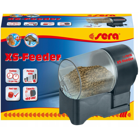 Automata akváriumi haletető Sera XS Feeder automatikus akváriumi etetőgép Automatikus, programozható akváriumi etetőgép nagyméretű, akár 150 ml eledel befogadására alkalmas tartályban. Tulajdonságok: automata adagoló granulátumokkal/pelletekkel val