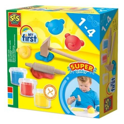 SES első gyurmáim szerszámokkal készlet Simítsd sodrófával, és lapítsd kalapáccsal a gyurmát! A SES első gyurmáim szerszámokkal készlet egy tégely kék, piros és sárga gyurmát, valamint fából készült sodrófát, kalapácsot tartalmaz, amikkel el tudod kez